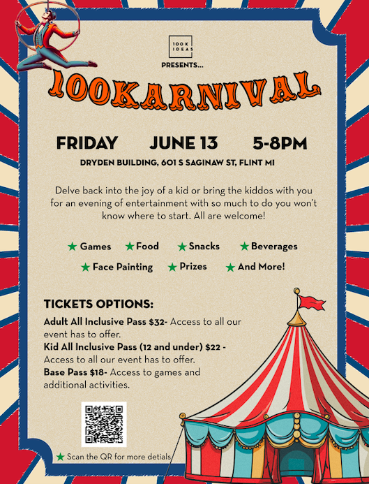 FLINT, Michigan — Get ready to relive your favorite childhood memories — with a purpose. 100K Ideas is bringing nostalgic summer fun to downtown Flint with its third annual student-led fundraiser, 100Karnival, on Friday, June 13, from 5:00 PM to 8:00 PM inside the historic Dryden Building (601 S Saginaw St).