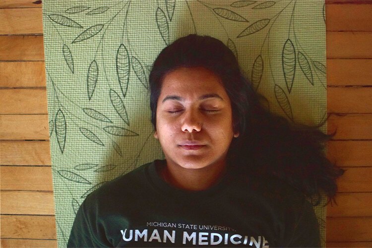 Flintside | Santiago Ochoa – A participant for the Holistic Recovery Hours lies in relaxation as sounds of waterfalls and Zen music play.
