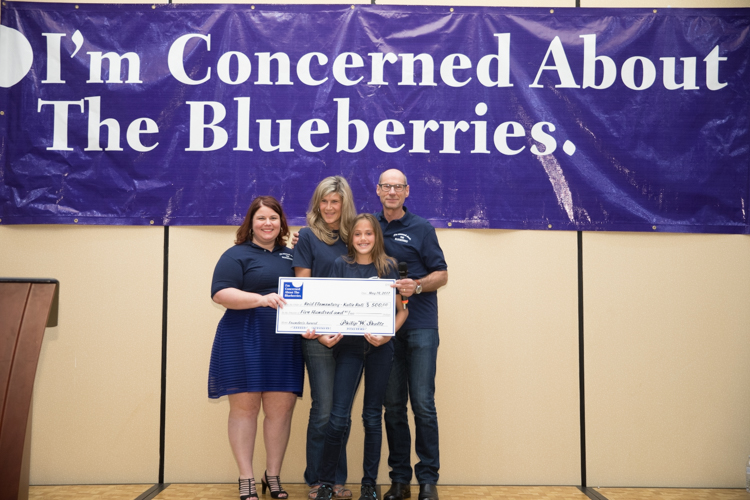Mike Naddeo – Marjory Raymer, teacher Kristie Philpott, 2017 Founder’s Award winner Katie Roti, and Blueberry Founder Phil Shaltz, pose for a photo. Shaltz makes a donation to the school to honor Katie’s Blueberry Moment.