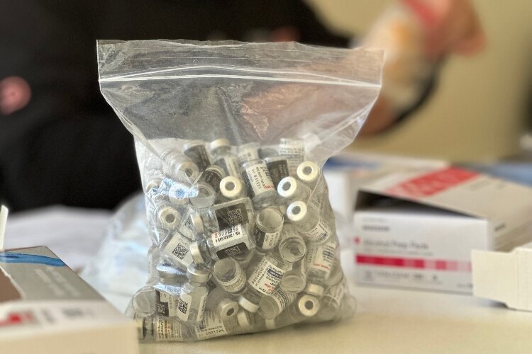 The bag is filled with all the empty COVID vaccines administered during the clinic.