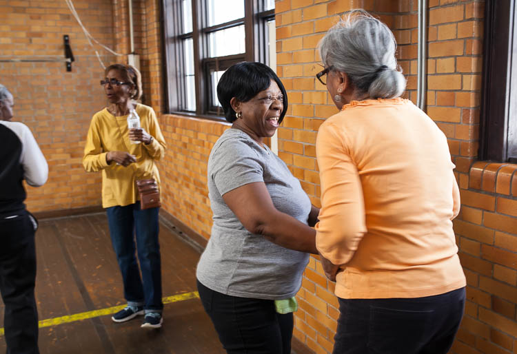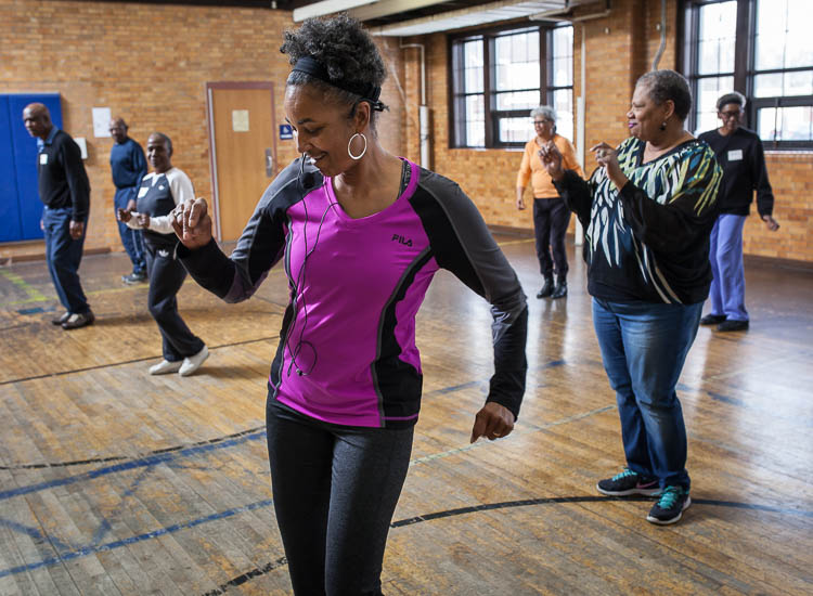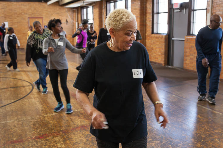 Most are from Flint but some come from Flushing Township and Grand Blanc. Peterson starts the music and they begin to move with a smile and perhaps a light-hearted groan. Other class members drift in and each is greeted by name and maybe a hug over the next half hour until it grows to 25 or so dancers for the 90-minute class.