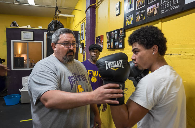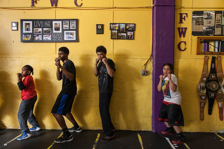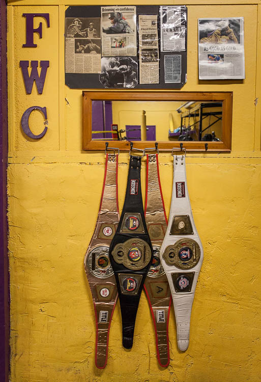In the basement, four championship belts hang on the wall of this boxing gym. It looks and smells like the history it has witnessed.
