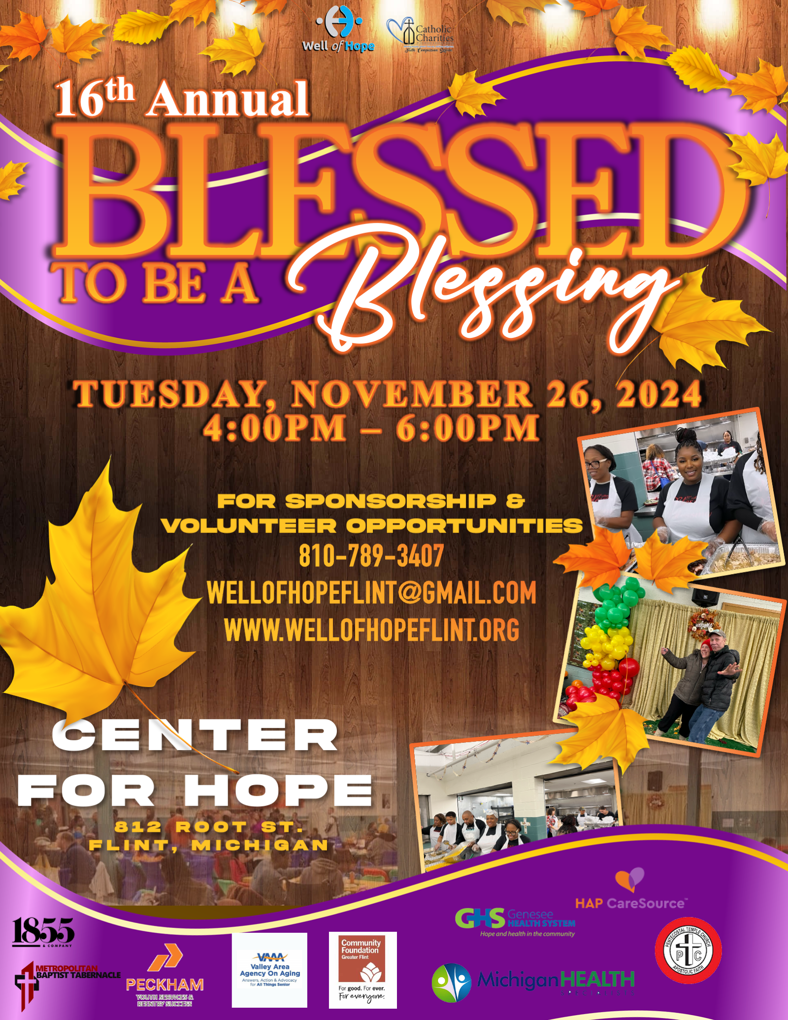 FLINT, Michigan — The nonprofit Well of Hope, in partnership with Catholic Charities, is set to host the 16th annual ‘Blessed to be a Blessing’ Thanksgiving dinner on Tuesday, Nov. 26, from 4-6 p.m. The event will be held at the Center for Hope, located at 812 Root St., offering a festive holiday meal and family-friendly activities designed to uplift the community.