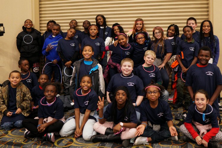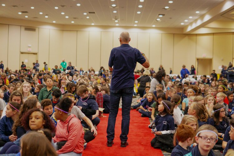 About 1,000 of the students participating in the program gathered on Tuesday, Oct. 22, 2019, at Riverfront Conference Center for the kickoff event which featured pizza, music, dancing and a message about why learning kindness is so important from Phil Shaltz, a downtown Flint businessman and founder of the Blueberry program. Flintside publisher Marjory Raymer, who helps coordinate the Blueberry program, served emcee for the event.