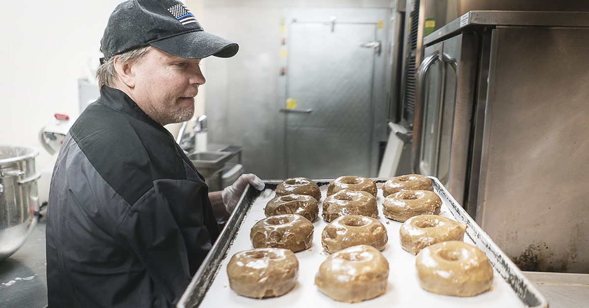 Both Sowles and Thompson are employees of Blueline Donuts and residents of Carriage Town Ministries, the largest homeless shelter in Genesee County. Sowles, who previously owned a bakery, serves as Blueline Donuts lead baker. With more than 30 years experience, he brings expert leadership to the donut shop where homeless people are employed, taught commercial kitchen skills, and build relationships with local police officers.
