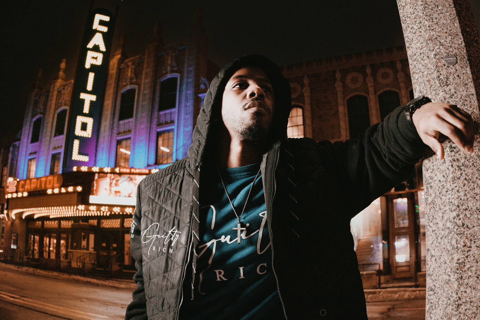 Dressed head to toe in a blue Guilty Rich sweatshirt and sweatpants combo under a black hooded puffer coat of the same brand, Houston spoke about his life as an award-winning actor, scriptwriter, filmmaker, athlete, and one of Flint’s emerging content creators.