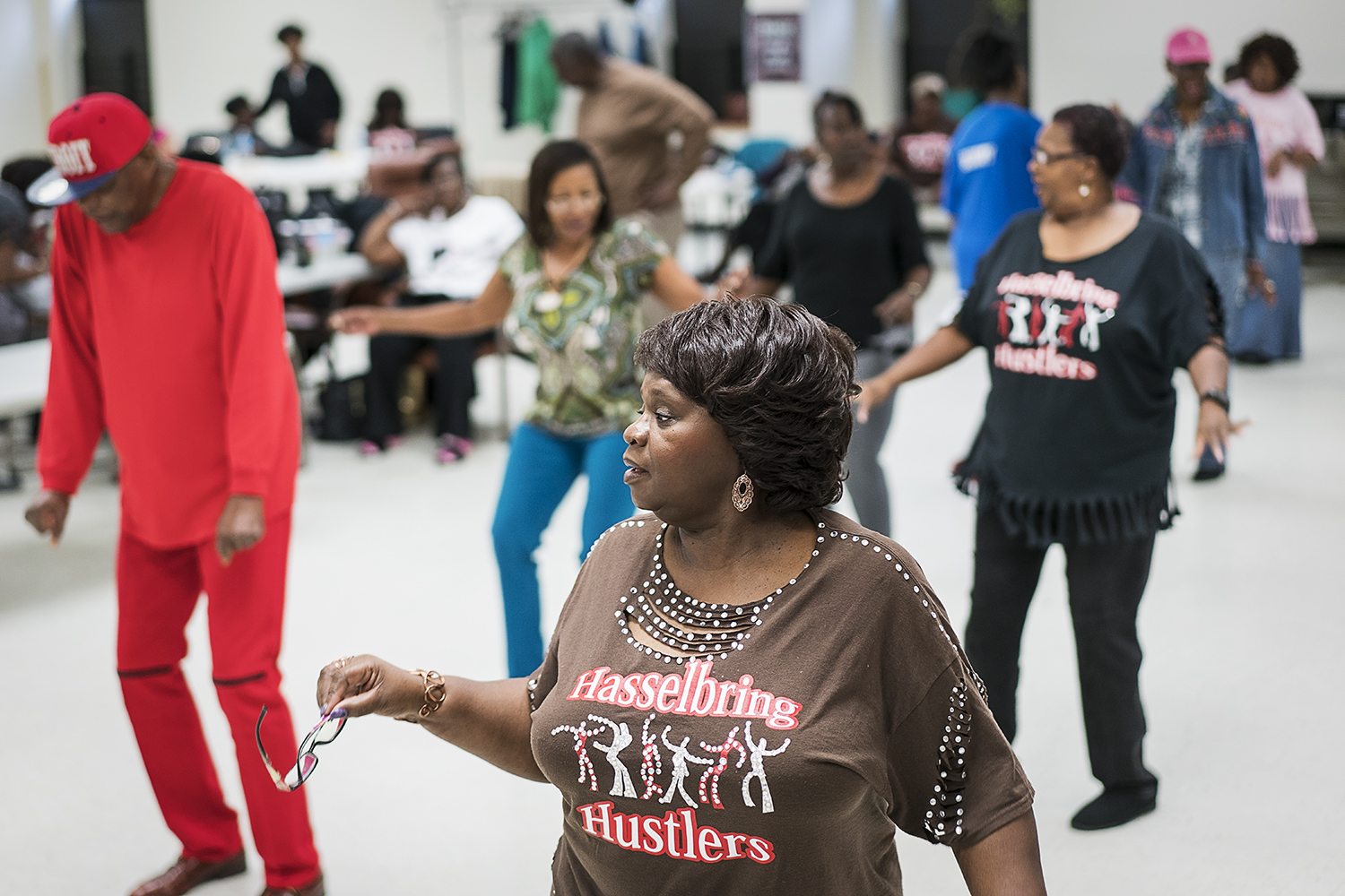 Tim Galloway – Gardell Haralson, 64, from Flint, calls out steps as the Hustlers dance at the Hasselbring Senior Community Center. Haralson earns little money from the two classes he teaches each week, insisting the money go to the center for improvements. “Some pe