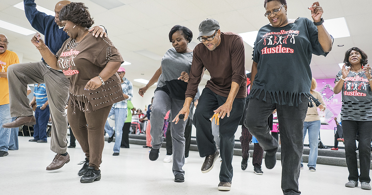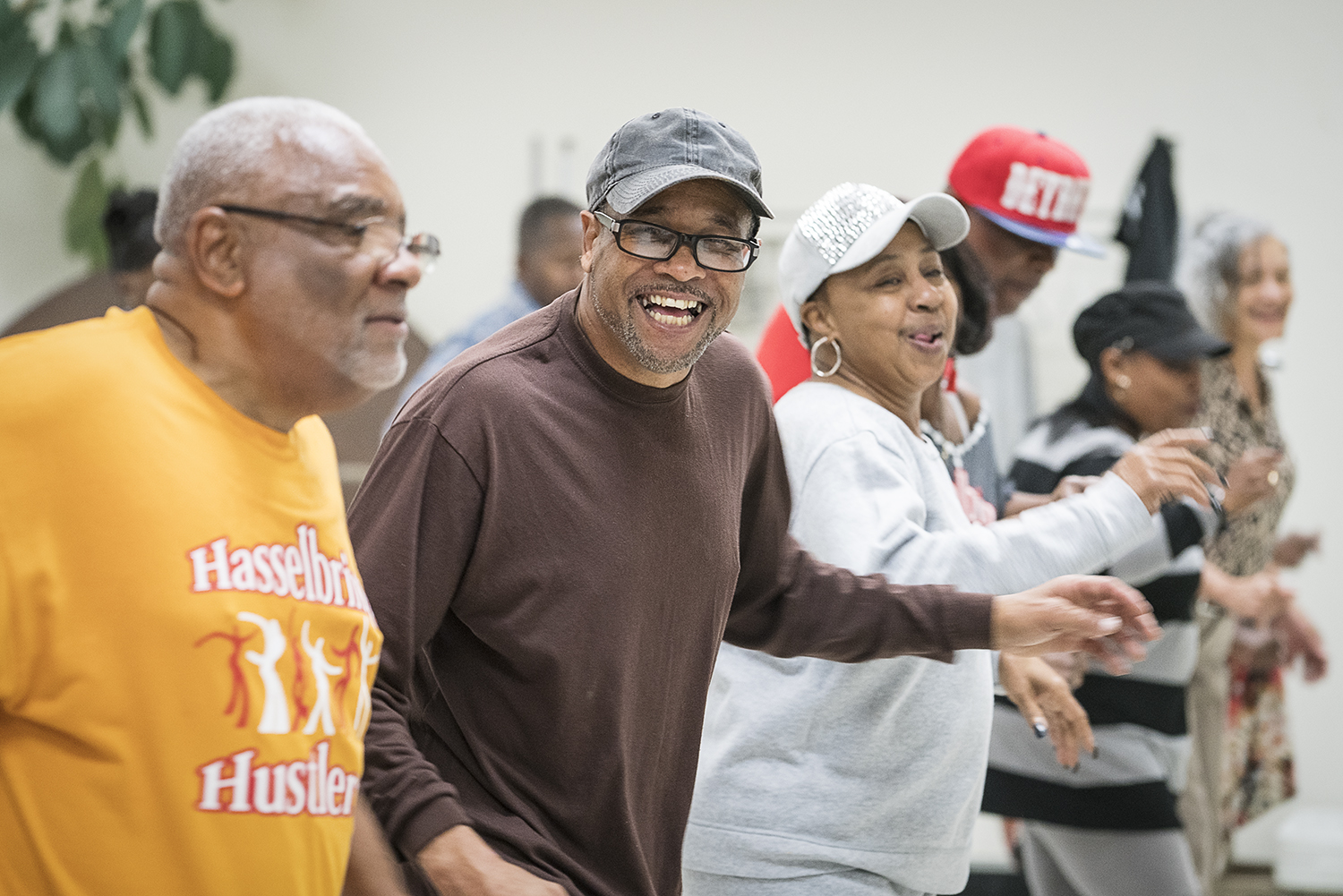 Tim Galloway – Gardell Haralson, 64 (center left) laughs as he dances with the Hasselbring Hustlers at the Hasselbring Senior Community Center. Haralson helped grow the Hustlers from a meager 15 participants to approximately 150 over the past four years.