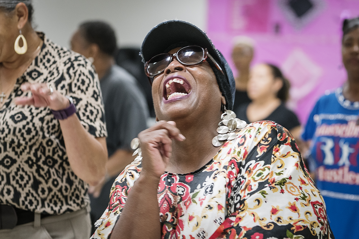 Tim Galloway – Hasselbring Hustlers committee chairperson Marva Johnson of Flint (center) wears her custom Hustlers shirt as she dances. She ended up starting a class at the center to teach others how to customize their own shirts.