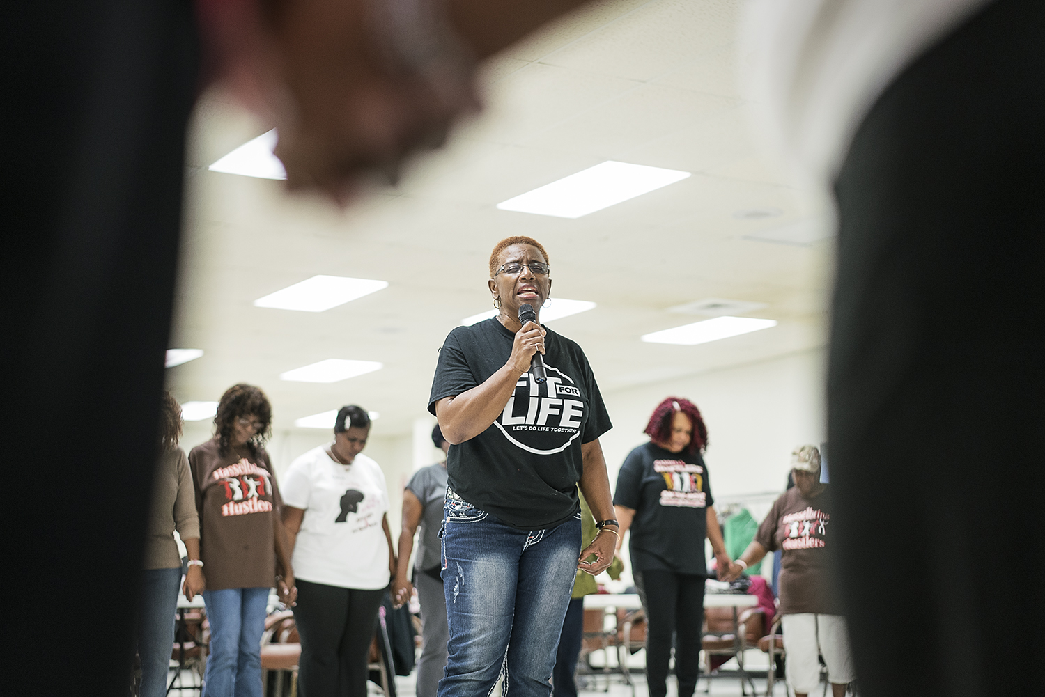 Tim Galloway – Queenella McGee, 66, of Flint leads the Hasselbring Hustlers in prayer before they finish their dancing for the day at the Hasselbring Senior Community Center.