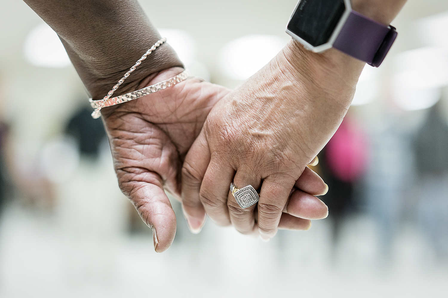 Tim Galloway – Two Hasselbring Hustlers hold hands during the closing prayer after nearly two hours of dancing at the Hasselbring Senior Community Center.