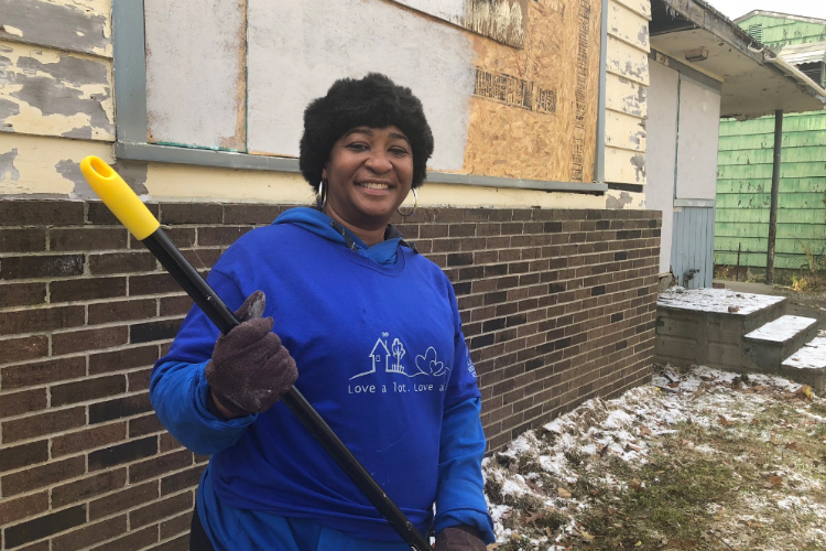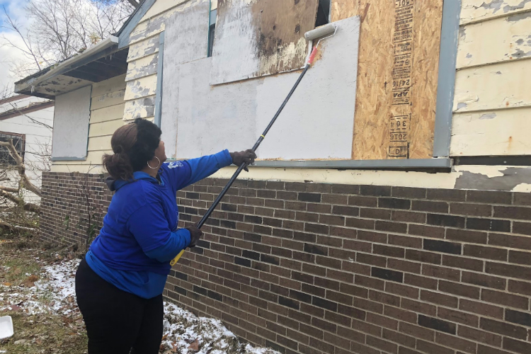 “Today, we’re working to eliminate blight and some eye-sores in the community as well as other activities to reduce crime,” Johnson says during a community cleanup event on Nov. 10, 2018. She grabs a paint roller and dips in grey paint near the frozen grass in front of a freshly boarded, abandoned house on Verdun Street. “Now I’m going to keep working while I’m talking to you, because we got a lot more houses to cover today.”Â