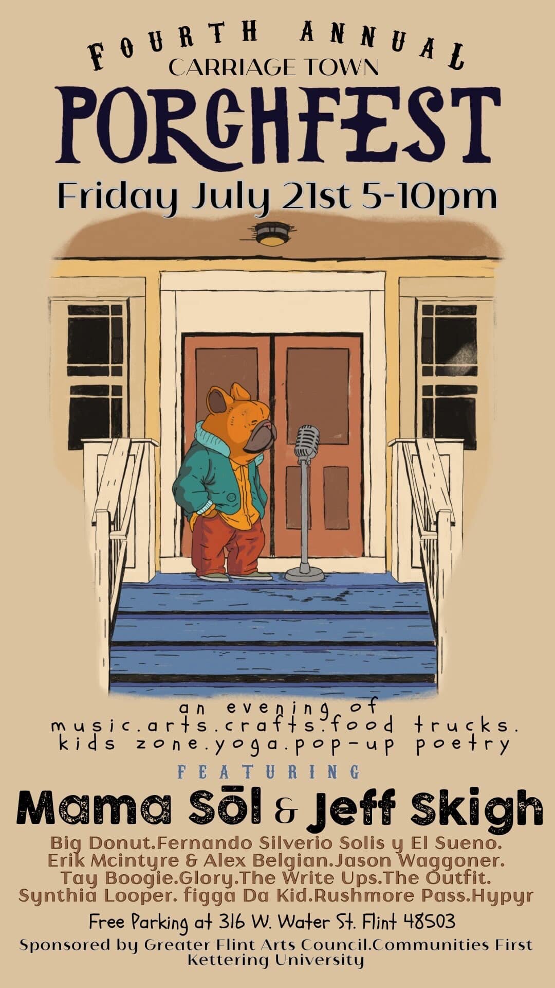 Sponsors of this year’s Porch Fest include Greater Flint Arts Council, Communities First Inc., Kettering University, LightSky Farms, Jars Cannabis, Inspire Canna Co, LASCO, and Foutch’s Pub.