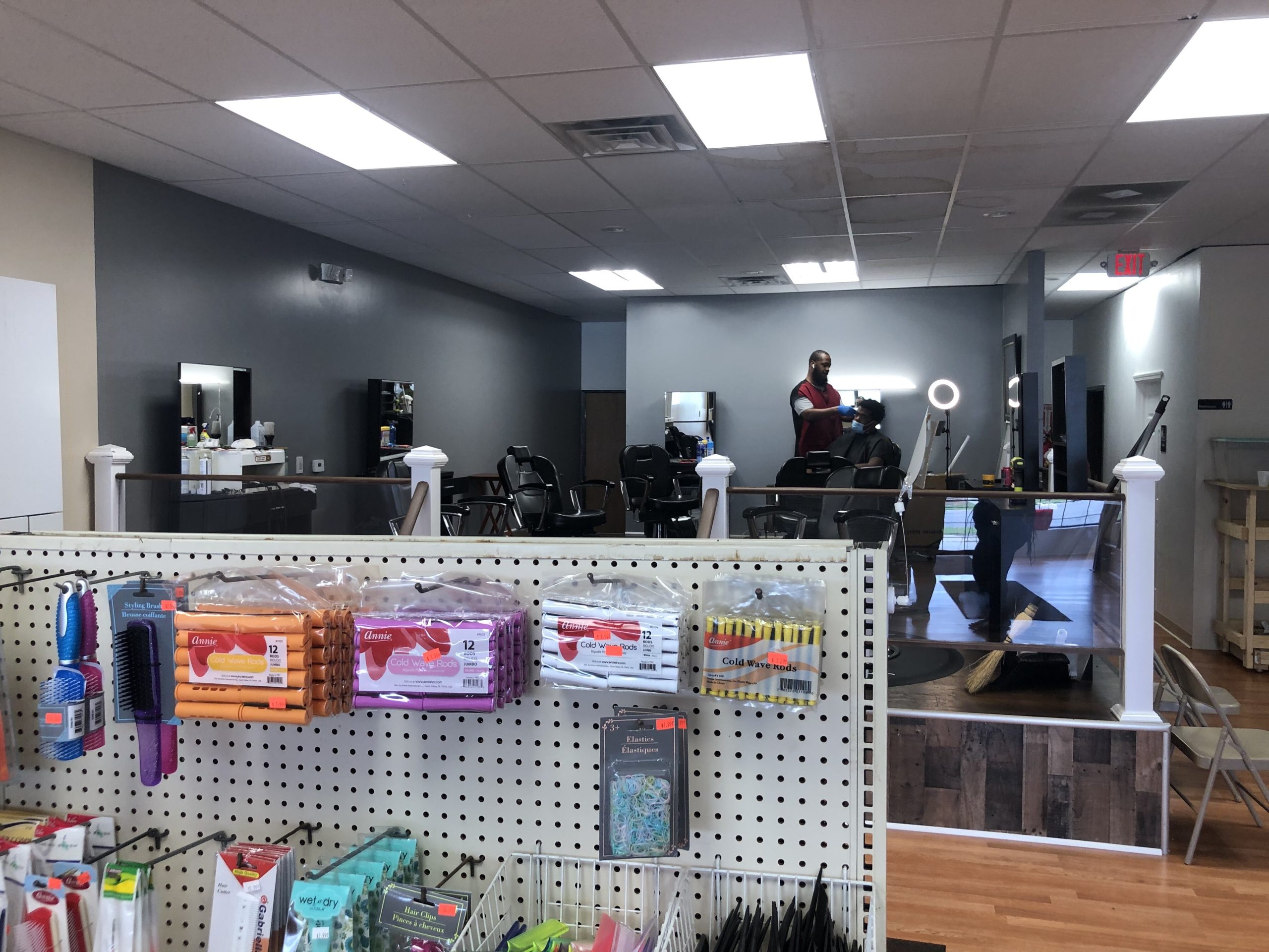 The store includes a barber and beauty shop area, as well as a variety of barber, beauty, and cosmetic supplies. There is also an aisle called “Black Wall Street” that features various beauty products from Black-owned businesses.