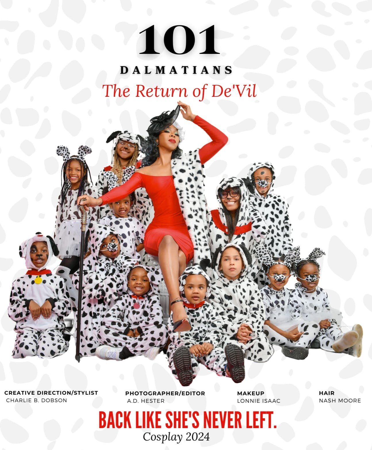 Titled ‘The Return of De’Vil,’ the photoshoot features Dobson and a crew of Dalmation cosplayers which included young students from her swimming class, We Swim Aquatics. Mari Copeny, widely known as Little Miss Flint, also made a special guest appearance.