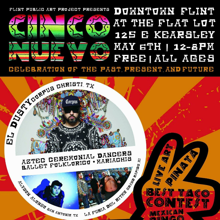 Cinco Nuevo sponsors include Team One Credit Union, Legal Services of Eastern Michigan, United Way, and American Metal Roofs and Print Sites. Partners include Flint Public Art Project, Sutorial Boot & Shoe Makers, Tenacity Brewing, Factory Two, and the Flint Children’s Museum. Poco Loco is catering the event.