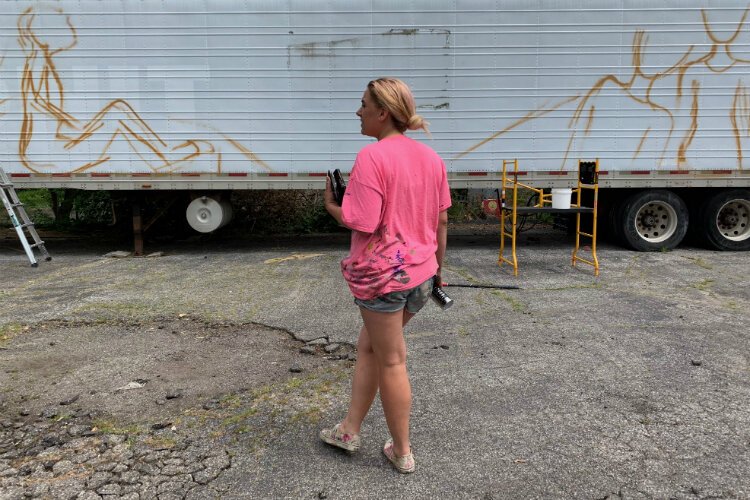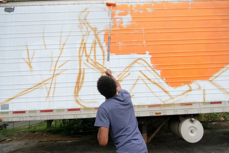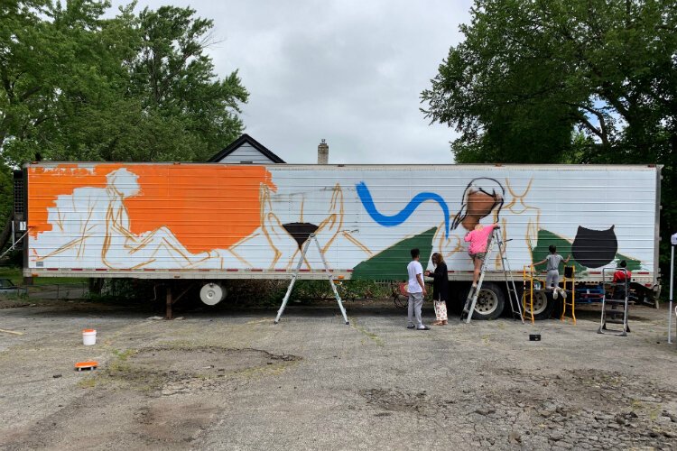 Work on the mural began late Friday morning with loose sketching, but by 2 p.m. the once blank trailer had blossomed into swaths of orange, blue, purple, and red. The work went quickly with several pairs of hands eager to help.
