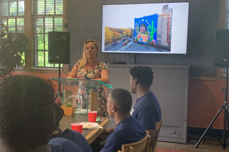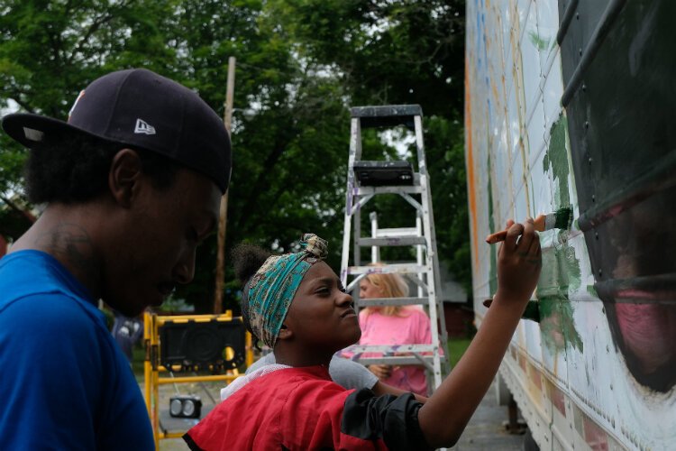 “I’ll tell somebody: ‘I made that or I helped make it,’” said Aniyah Colston, 13, who along with her cousin Izereya Austin, 9, were recruited from the Claressa Shields summer camp to participate in the mural project.