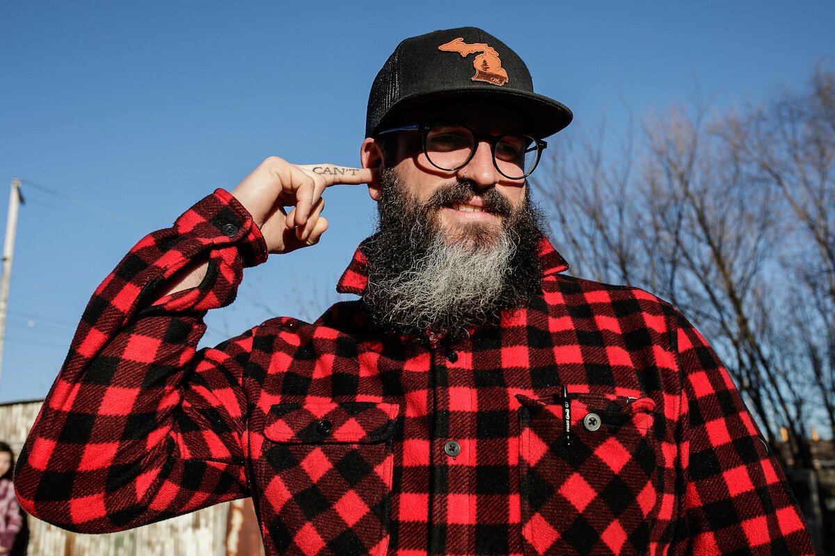 Jenifer Veloso | Flintside – Clay Parks holds his middle finger with the word, “can’t” tattooed on it, up to his ear.