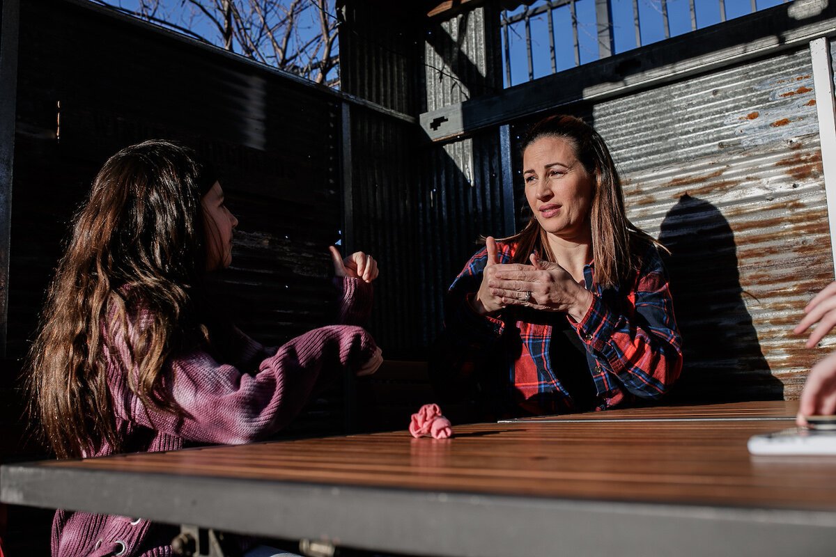 Jenifer Veloso | Flintside – Yuliette and Giselle Parks sign to one another while sitting outside.
