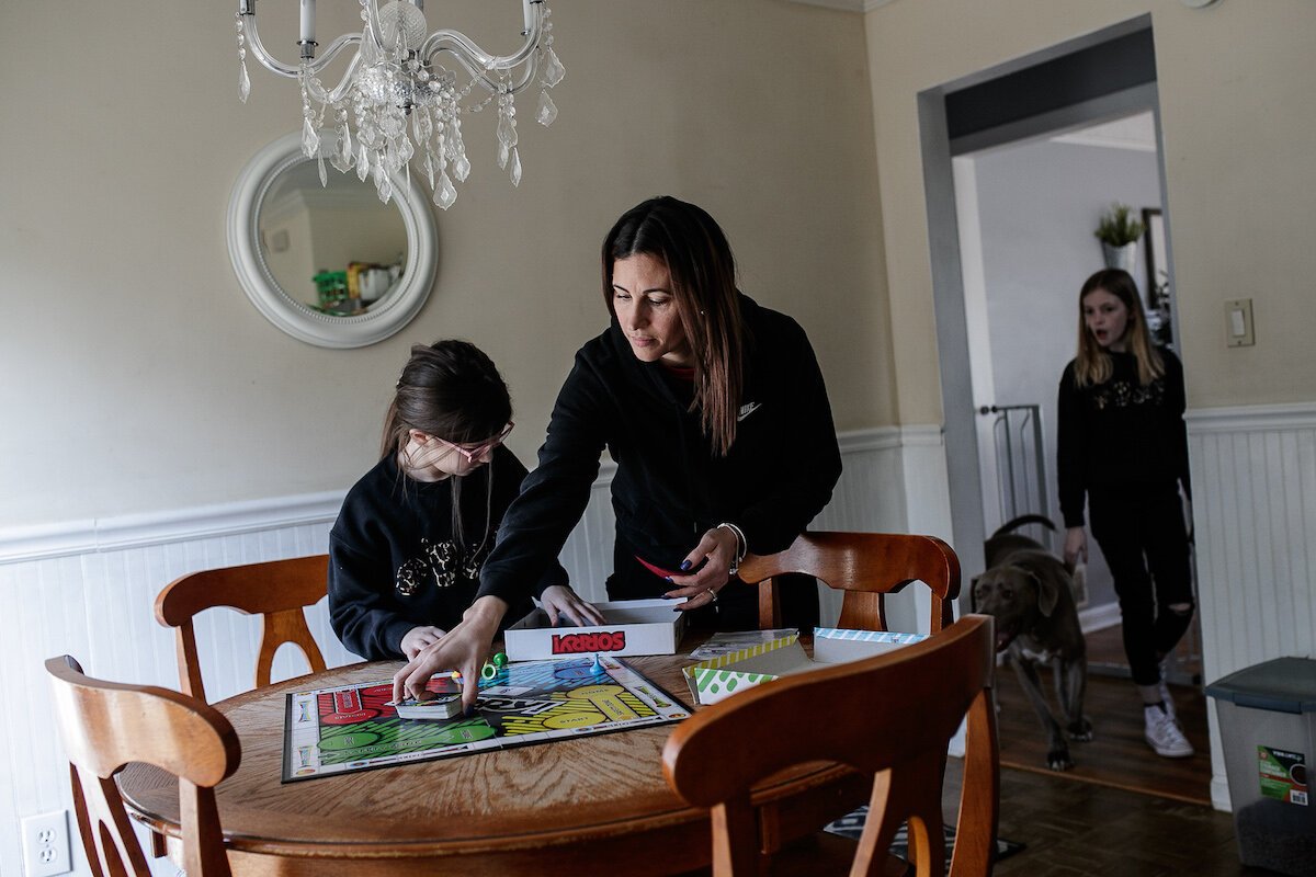 Jenifer Veloso | Flintside – Giselle, Yuliette and Lily Parks set up a board game to play together at home.