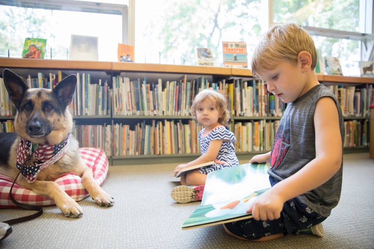 “If kids come to the library mostly to visit the dogs, that’s fine,” said Schwartz. “Our hope is that they leave the library with an armload of books and a plan to come back for the next Tell-A-Tail.”