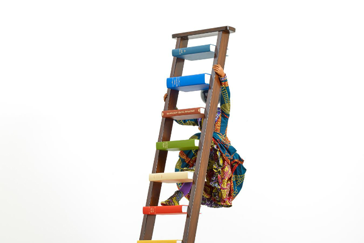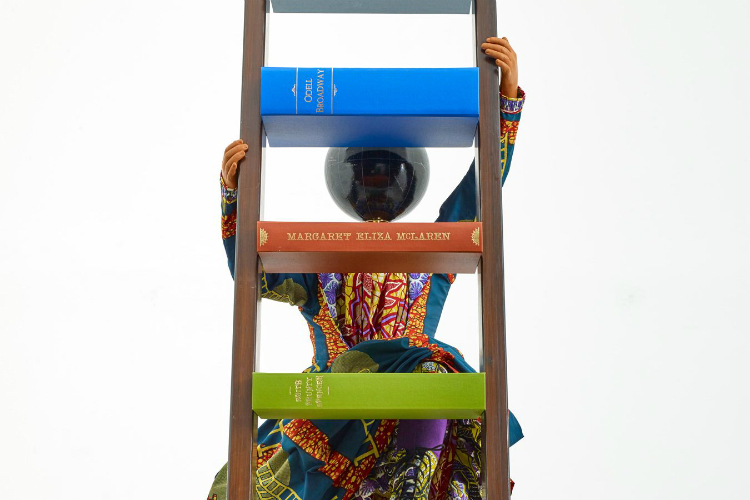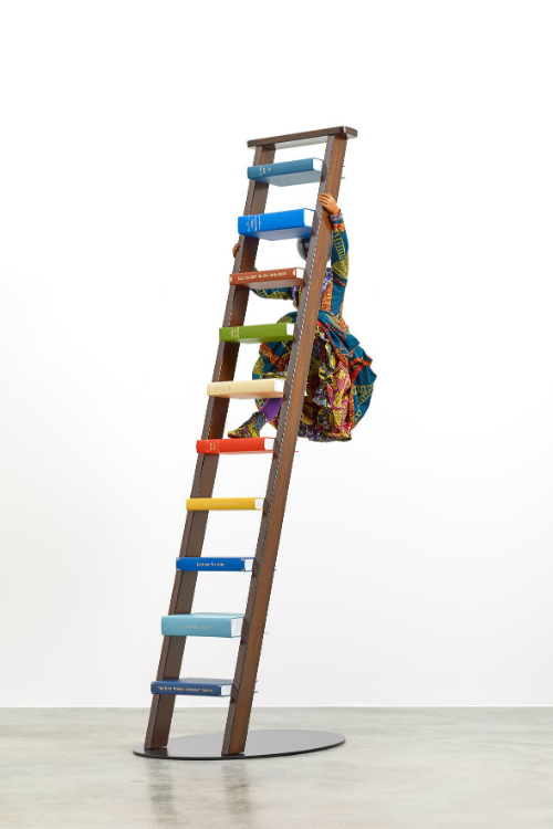 The sculpture stands just under 10 feet tall and features a mannequin dressed in Dutch wax printed cotton, a common medium used by Shonibare, climbing the underside of an angled ladder. The rungs of the ladder are made from books, each with the name of a Flint woman inscribed on the binding. It is one of several “Magic Ladder Kids” sculptures created by Shonibare, an award-winning and internationally-known artist.