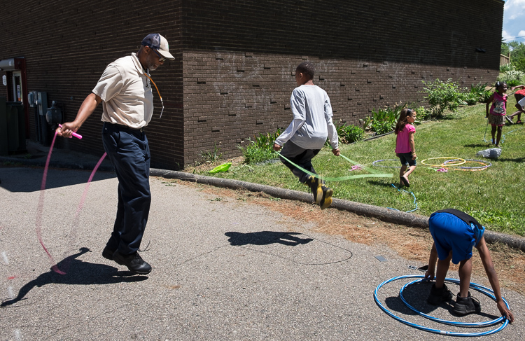 On the front lawn, kids run and jump rope. “Mr. Sam,” as he is called, makes his way to where they are and joins in, displaying his own rope jumping skills. Though he is there for only 20 minutes or so a day, the kids in this summer program know Berry. He’s the man with the smile on his face and the one who brings them lunch. “When they start learning my name, they’ll be jumping and waving. They’ll be calling my name when I pull up,” says Berry. It’s his job to feed these children, to engage with them, and prepare them for the nutrition-based activity by the two-person team that follows Berry from site to site.
