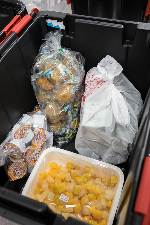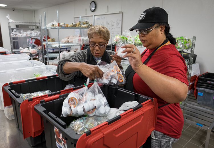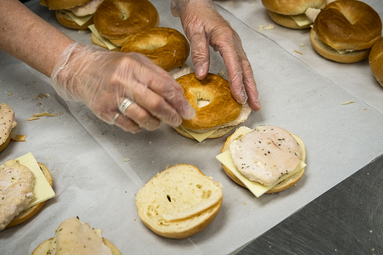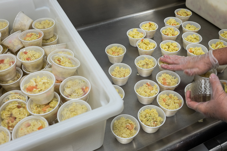 The Food Bank hired head chef and production manager Dustin Marshall to produce recipe-based, “from scratch” meals in the gleaming state-of-the-art, stainless steel production kitchen. It is here that Marshall can be found roasting sweet potatoes in one of the many commercial ovens in place and where whole-breast chicken sandwiches or roast beef wraps are created. It’s where team leader Deanna Johnson might be making pasta salad on a given day.
