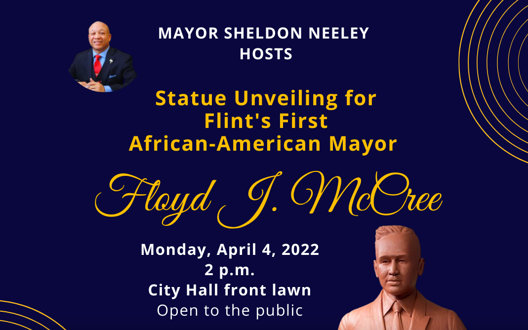 FLINT, Michigan — Mayor Neely, the Community Foundation leadership, and family members of Floyd J. McCree cordially invite the Flint community to the official unveiling ceremony of the Floyd J. McCree bronze statue on the front lawn of Flint City Hall at 2 p.m. Monday, April 4, 2022. The occasion recognizes McCree as being the City of Flint’s first Black mayor.