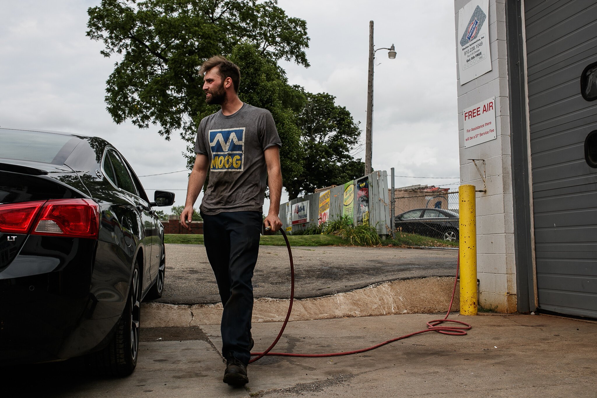 RaskE, born and raised in Flint, specializes in rap, Hip Hop, rock, and pop music, and it’s the vehicle that drives him through the interconnected musical lanes. This ability to weave in and out of genres allows his music to expand the way it has and is evident on the soon-to-be-released album he, Shelton, and producer Selah Zeus are conceiving. But very little of RaskE’s life comes packaged together and well produced in the way his music does, blaring from the speakers. Instead, it comes much like he appears: mildly dirty with oil and grease stains covering his face, hands, and uniform from a hard day’s work at Shelton Automotive on University Ave—which is where we are. His time getting to know and fall in love with the internals of each vehicle concurrently enhanced his ability to handle and deal with his emotions and life. It is a life he says is similar to the cars he works on every day.