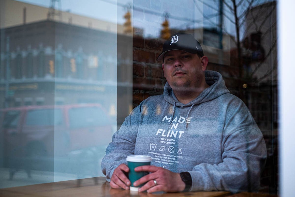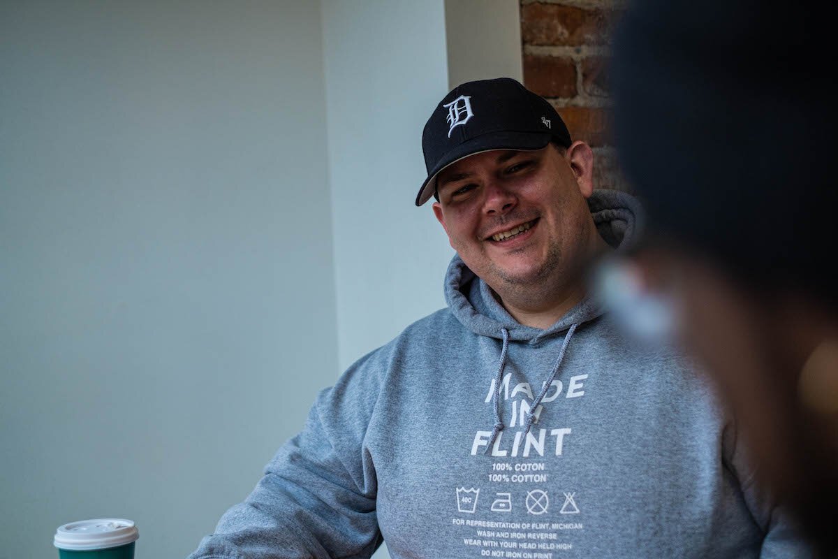 FLINT, Michigan — Inside Fosters Coffee in downtown Flint, on a cold, cloudy Wednesday morning, Flint artist Shemy, dressed in a gray Eight One Zero hoodie, blue jeans, and a black baseball cap, tells me about his life. He has left me laughing, bewildered, and inspired. We’ve settled ourselves at the front of Fosters, on display for downtown traffic, and the photographer, joking about how to capture his “good side” in addition to him correcting me on how to pronounce his last name—one of Syrian origin passed down from his father who was adopted.