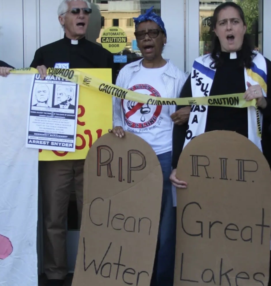 Her “R.I.P. Clean Water” tombstone, made out of cardboard, had been confiscated. Yet somehow, her white shirt remained bright and clean, bearing the words that summed up the demonstration: “Flint water crisis: four years too long.”