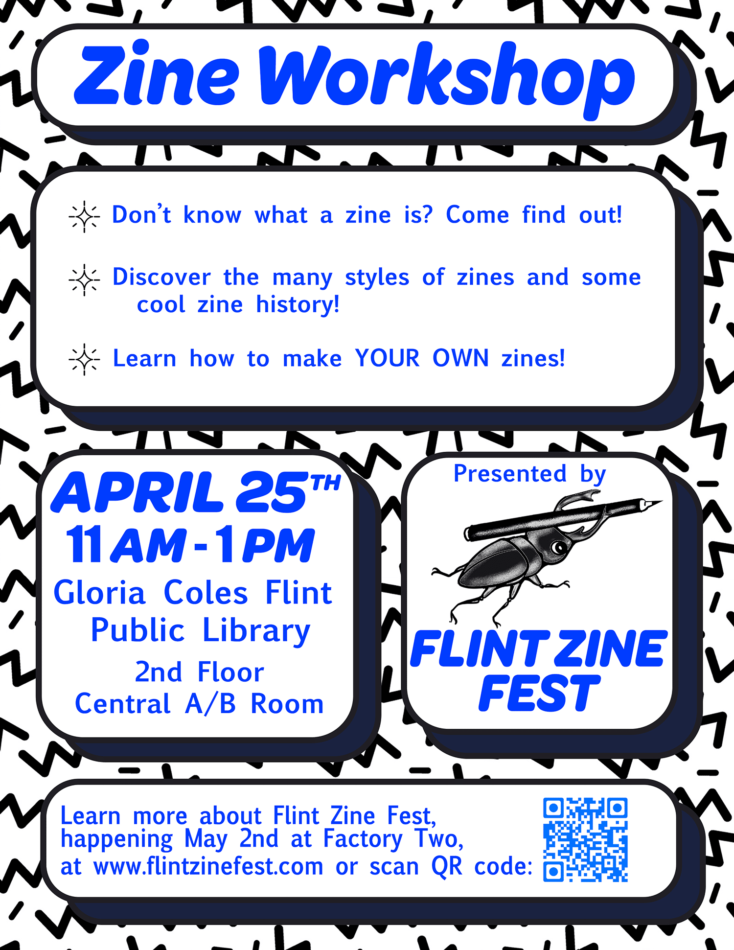 Another kick-off event takes place on Saturday, April 25, at 11 a.m. at the Gloria Coles Flint Public Library. The community is invited to make their own four-paneled zine to trade at the event in May.