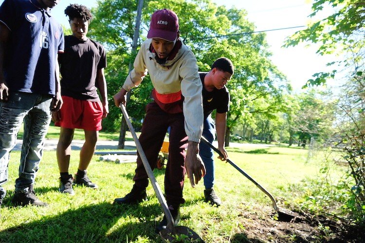 FLINT, Michigan — It’s 9 am on the main floor of Joy Tabernacle Church and there are already several tasks to be accomplished between the several young men seated. A crew of 12 make up the Flint Grounds Crew, young men 15 to 22 years old. They sit along the long table, chatting amongst themselves and preparing for a full day of cleaning and landscaping.