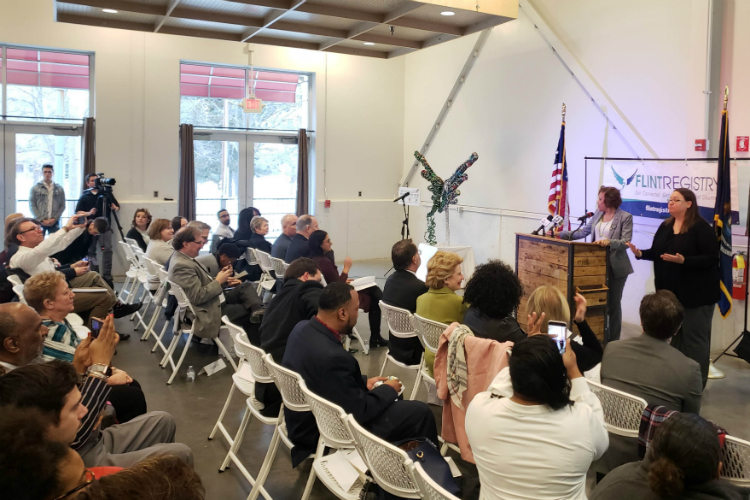 Organizers celebrated the official launch of the registry at the Flint Farmers’ Market on Friday, Jan. 18, 2018. Federal legislators — including U.S. Rep. Dan Kildee, Sen. Gary Peters, and Sen. Debbie Stabenow — were thanked for their efforts to secure funding for the registry as part of the Water Infrastructure Improvements for the Nation Act of 2016.
