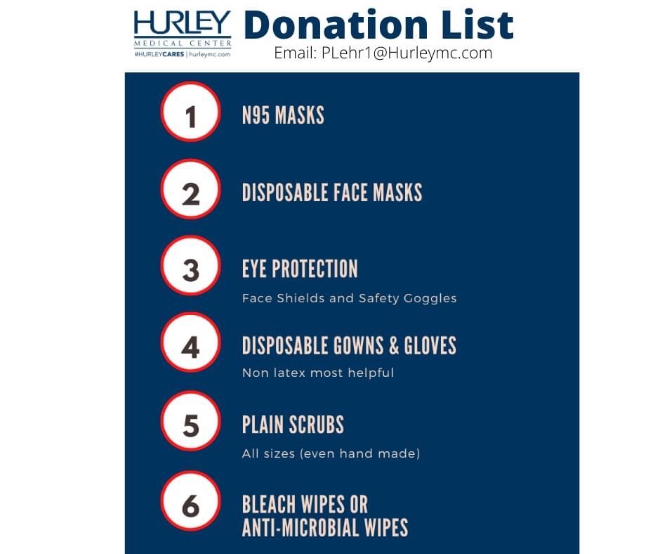 Hurley is not accepting home-sewn masks, 3D printed ventilator parts, medications or any other additional medical equipment than those previously listed.