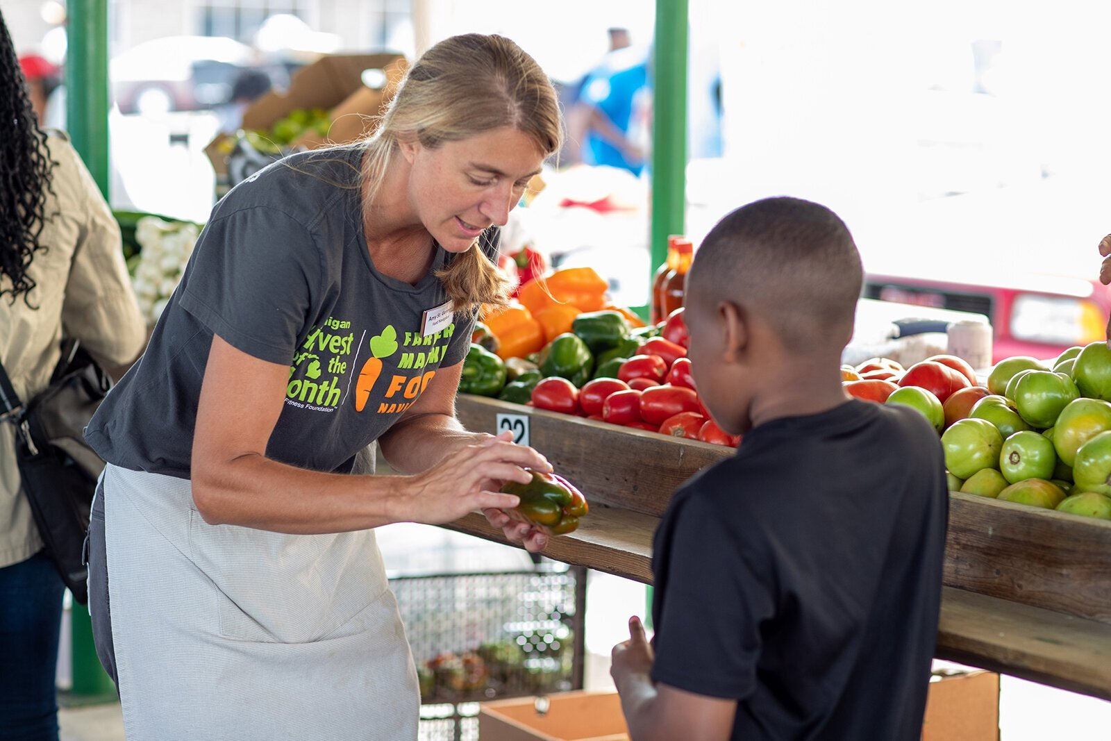 “They have really become a community of friends,” St. Germain says. “Michigan Fitness Foundation’s Farmers Market Food Navigator program is so much more than a program. It creates community. People meet me at my market booth, almost like a coffee hour. I share nutrition information with them about the fruits and veggies that are in season, share cooking tips, a recipe sample, and we chit-chat. I get a lot of seniors who are widowed and looking for new ways to spend their time. They find themselves here connecting with each other. There’s a comfort level. They know they can ask questions, share concerns, have fun, and know that it’s a safe environment.”