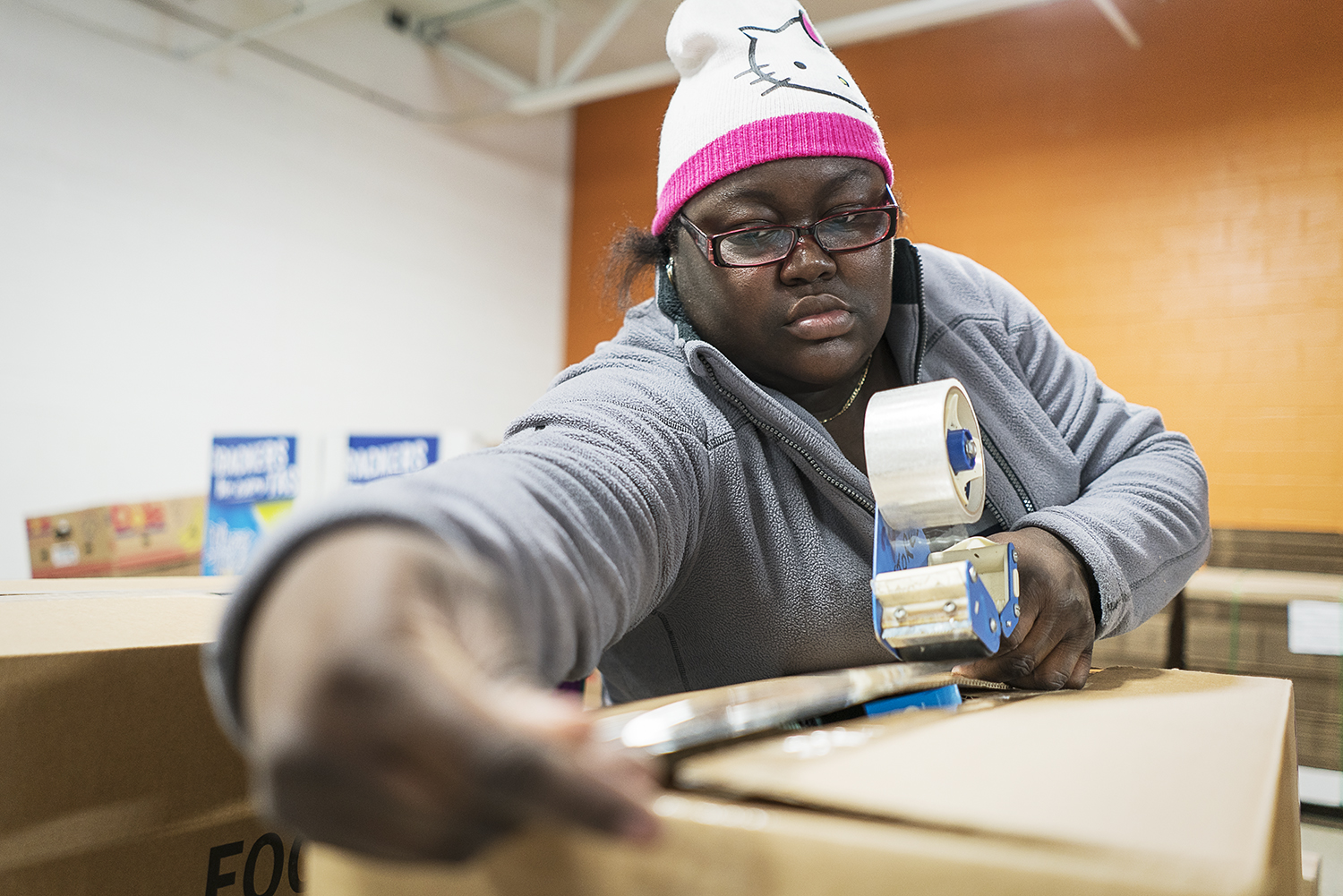 “I like giving back… I wanted to see how it all operates,” she says as she closes and tapes a box filled with stuffing and cranberry sauce and a few other special treats.