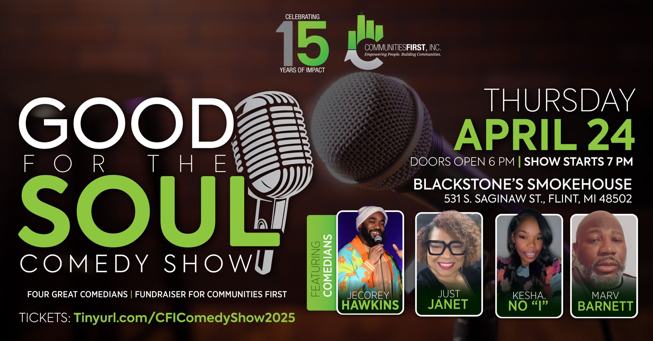 Flint residents are invited to the 'Good for the Soul' Comedy Show on Thursday, April 24, at Blackstone’s Smokehouse—a fundraiser supporting Communities First, Inc.’s work in affordable housing, economic development, and community programs.