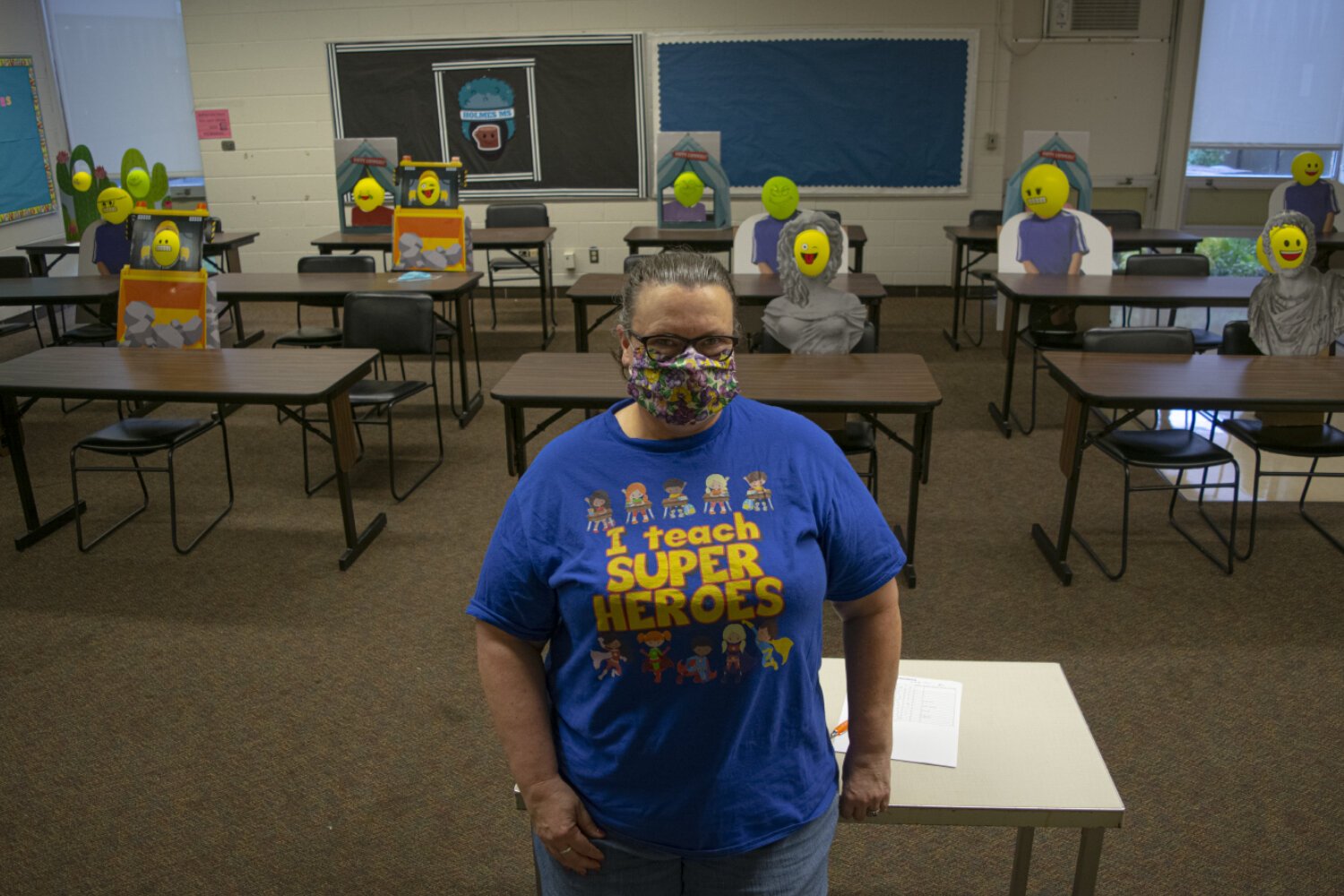 To remedy this, Olayinka took a page straight out of the National Football League’s COVID-19 playbook and filled her classroom’s seats with what can best be described as cardboard cutouts of students. “I was watching football and saw cardboard people sitting in the stands and I said ‘oh wow, that would be great,’” Olayinka said. “Then I could set up my camera and teach on the board to my students and to my pretend class. I thought I would feel much better and I do.”