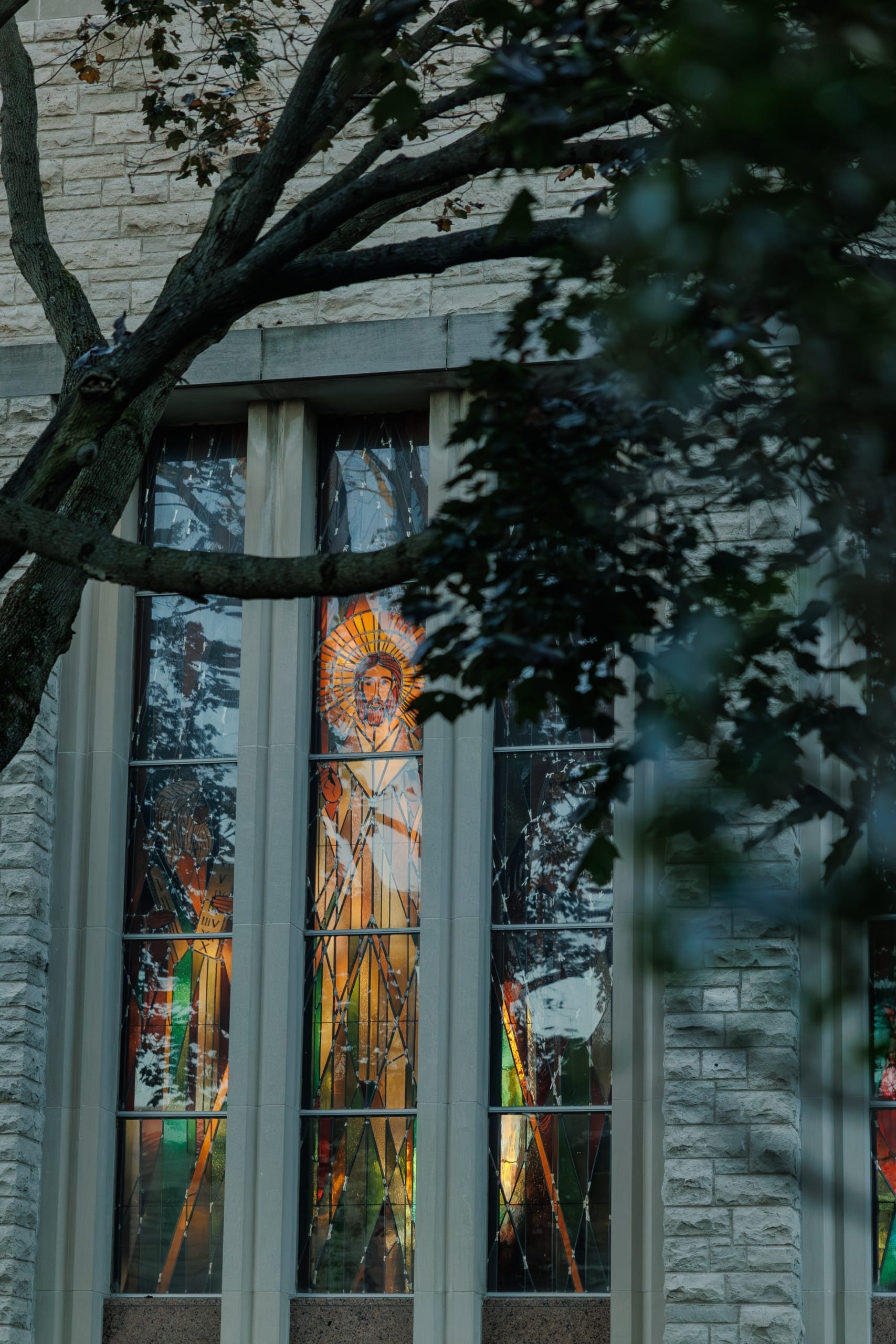 Stained-glass Jesus glows through the window in the fading evening sunlight on Sunday Oct. 19, 2025. Anthony Summers | Flintside