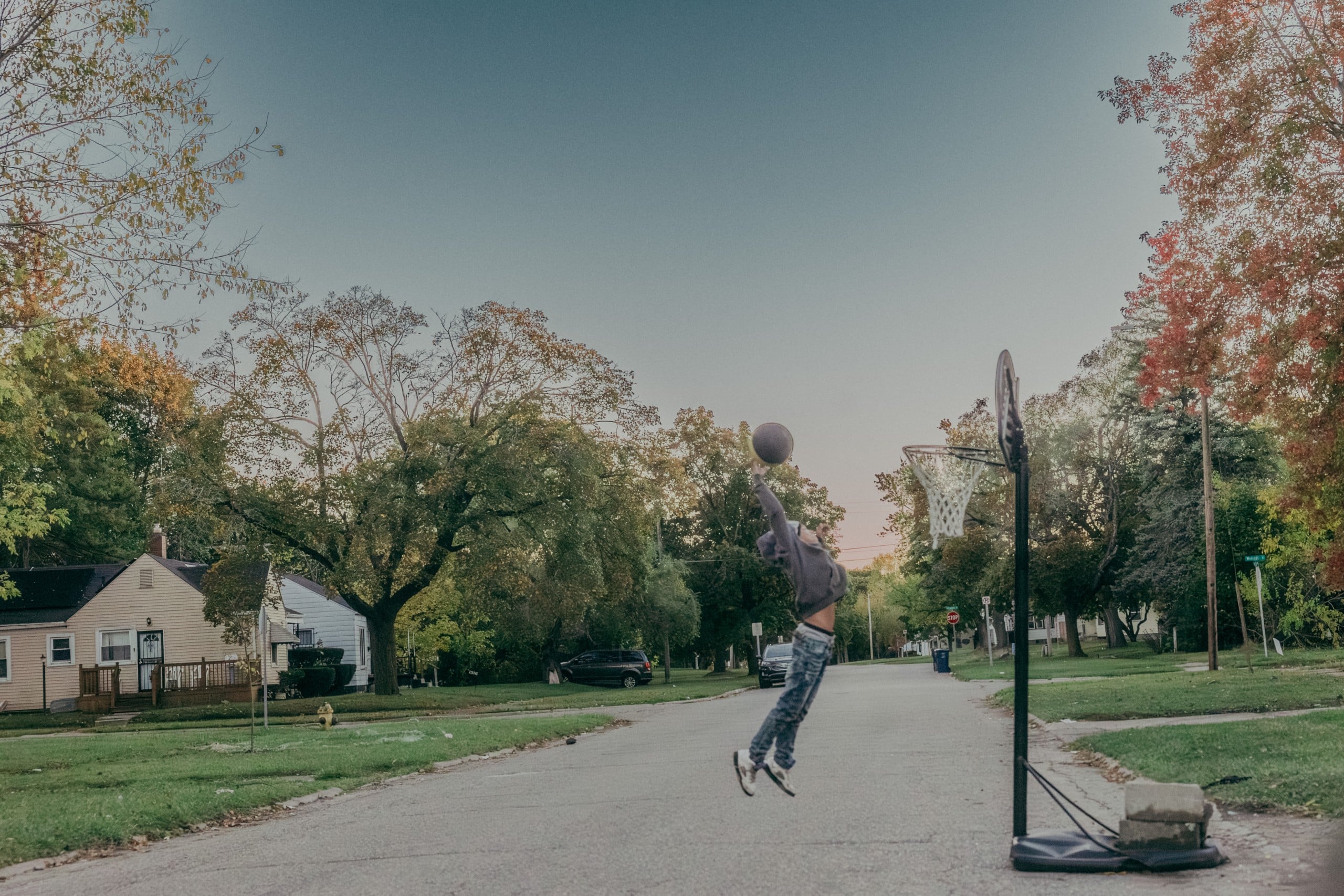 A child leaps to make a layup in the middle of the street on Sunday Oct. 19, 2025. Anthony Summers | Flintside