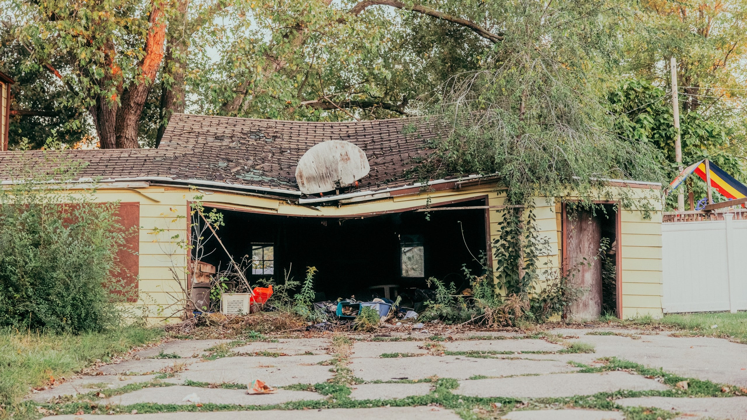 An abandoned garage ready to collapse at any moment on Sunday Oct. 19, 2025. Anthony Summers | Flintside