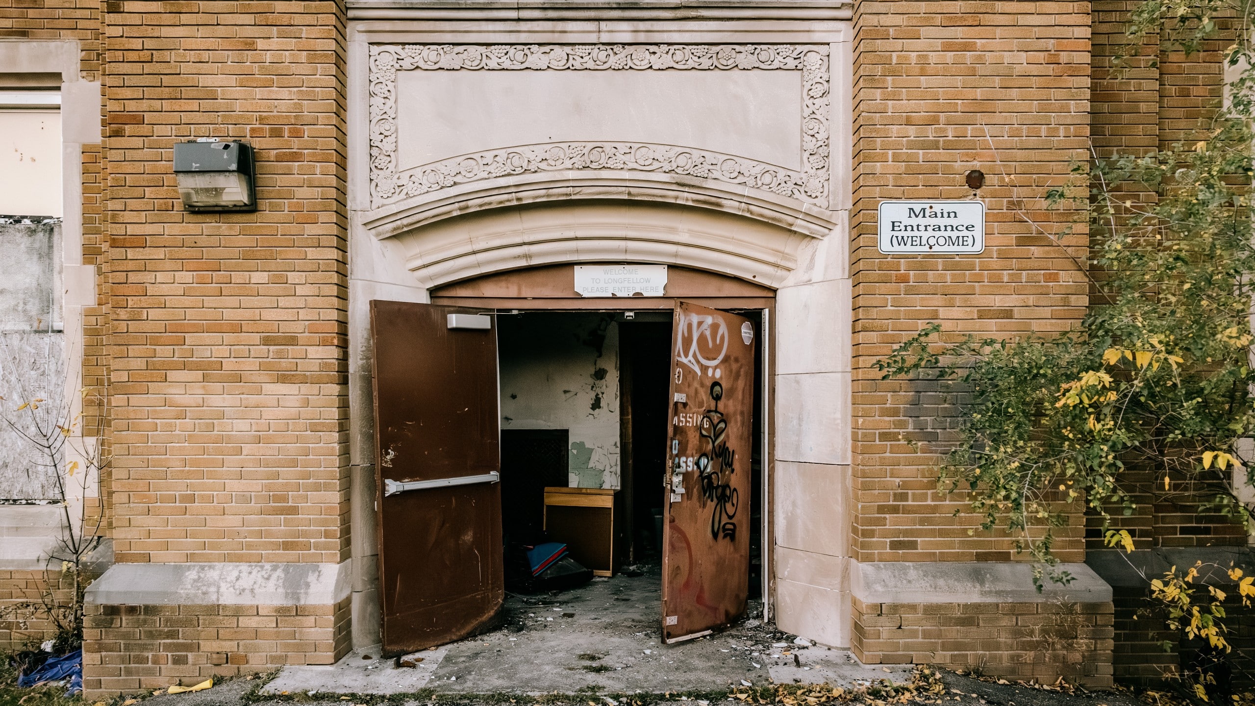 An abandoned school entrance sits open to the elements on Sunday Oct. 19, 2025. Anthony Summers | Flintside