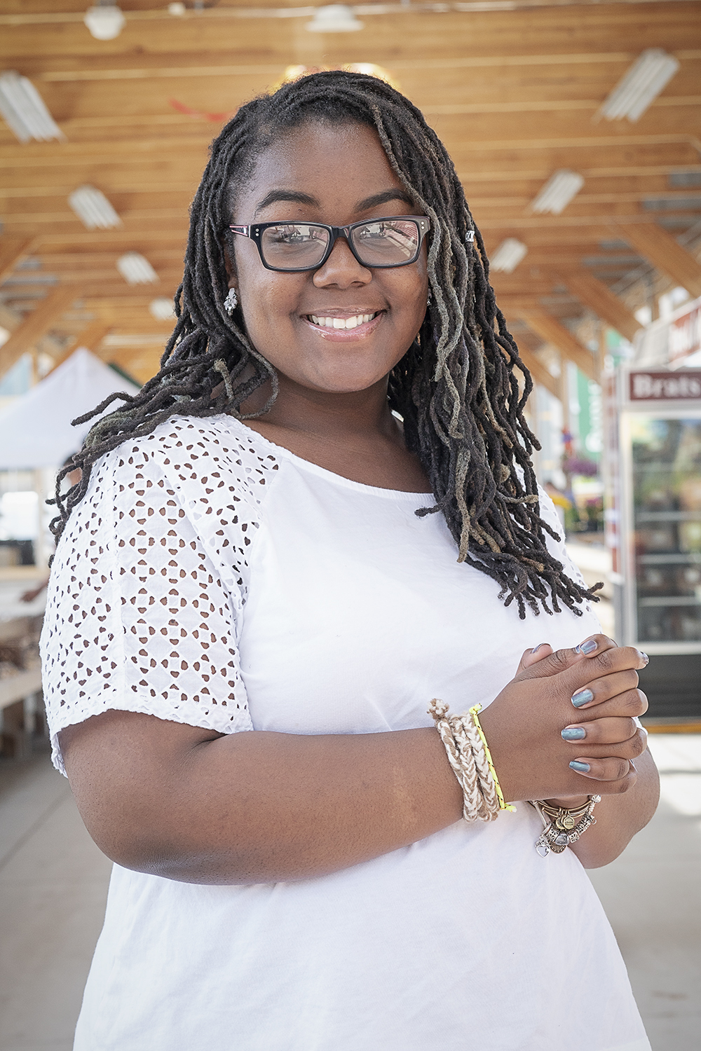 FLINT, MI – Bookmarks, buttons and postcards cover a tabletop in the Flint Farmers’ Market on a busy Thursday afternoon in June. International Academy of Flint students Raven Hullum, 14, and Erin Long, 17, look over their creations with pride.