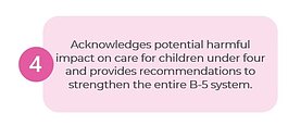 “La Hoja de Ruta reconoce muy claramente que el preescolar es una parte de un proceso continuo de atención y educación, con la esperanza de que la posible aportación de estos fondos proporcione más apoyo y contribuya a reforzar otras áreas, desde el espacio prenatal hasta los tres años, y luego ayude a proporcionar un traspaso cálido al jardín infantil”, dice Eileen Storer-Smith, gestora de programas de la W. K. Kellogg Foundation, una de las cuatro organizaciones que proporcionaron apoyo financiero para desarrollar la Hoja de Ruta PreK Para Todos.