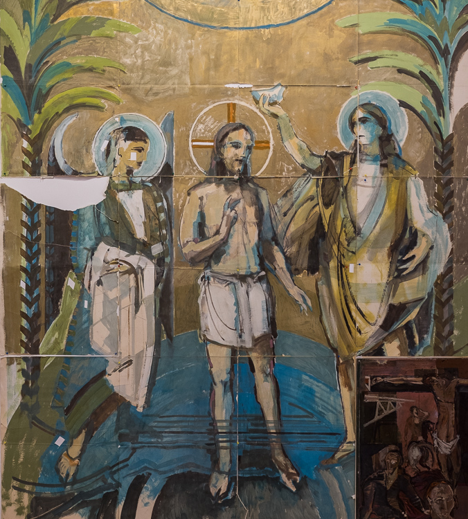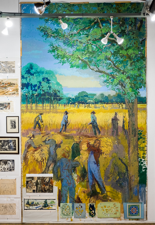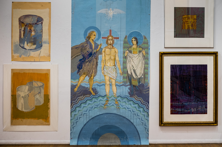 As it is, this retrospective is wall-to-wall and floor-to-ceiling. It chronicles the work of a talented native son, a Flintstone of the art world. Born in Flint in 1924, Davidek began taking art classes at age 7 or 8. His aunt Mary would take the boy by streetcar to a studio in the upstairs space over Reo Samon’s garage attached to the Samon Building where the Flint Institute of Art was housed in the early 1930s. “It was magic,” he would later tell an interviewer. One could say it began there, a passion of drawing, painting, and silkscreen. Davidek raised his family by painting, though in his case it was in producing decorative painting on interior walls in homes, churches, and area businesses. That was the continuation of a heritage that began generations ago in the Davidek family in Europe and one that continues to this day with family members carrying on the business.