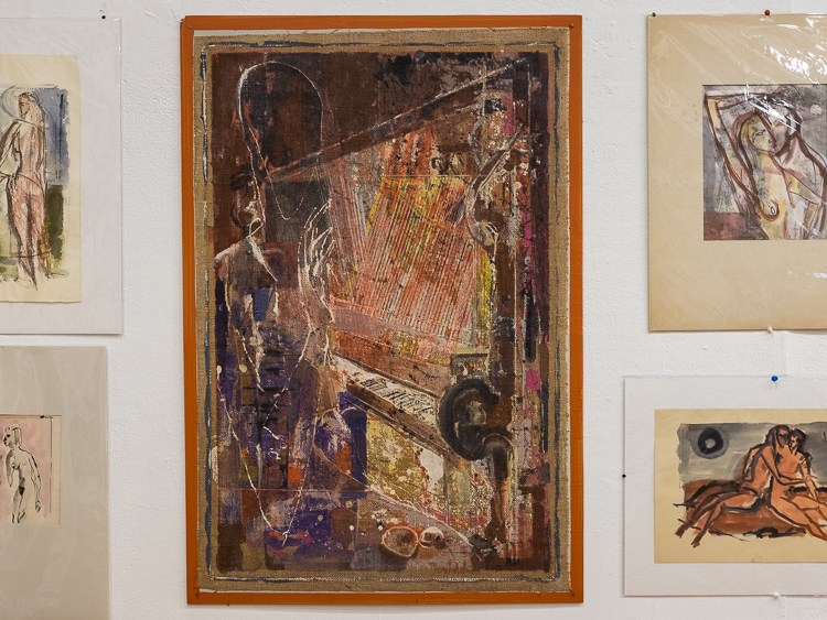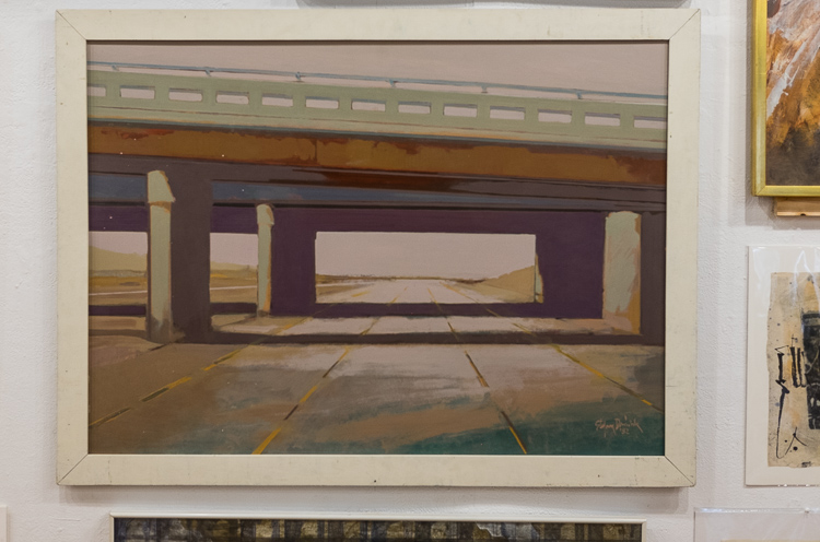 Patrons to the exhibit will see early pencil, chalk and ink drawings and watercolor, oil and acrylic paintings. The viewer will see large paintings of interstate bridges situated within the interchanges in downtown Flint. There are colorful abstracts in oil and watercolor mock-ups of murals design to be applied to area churches. There are several silkscreen works that became his mainstream in later years along with portraits and figure paintings that reflect the macular degeneration he suffered at the end of his career.