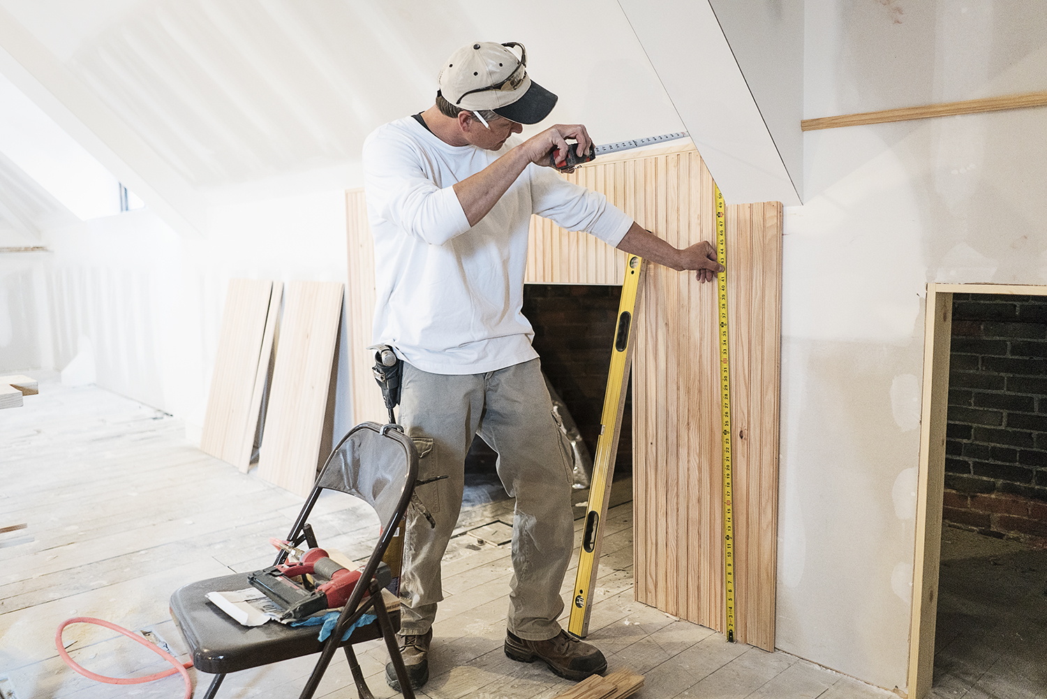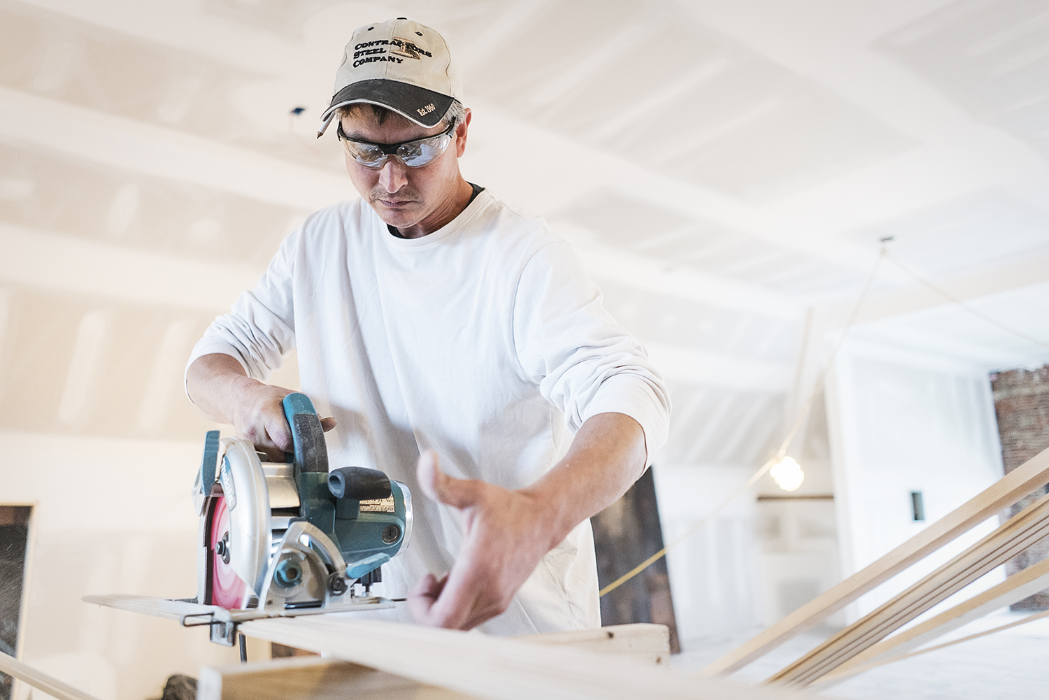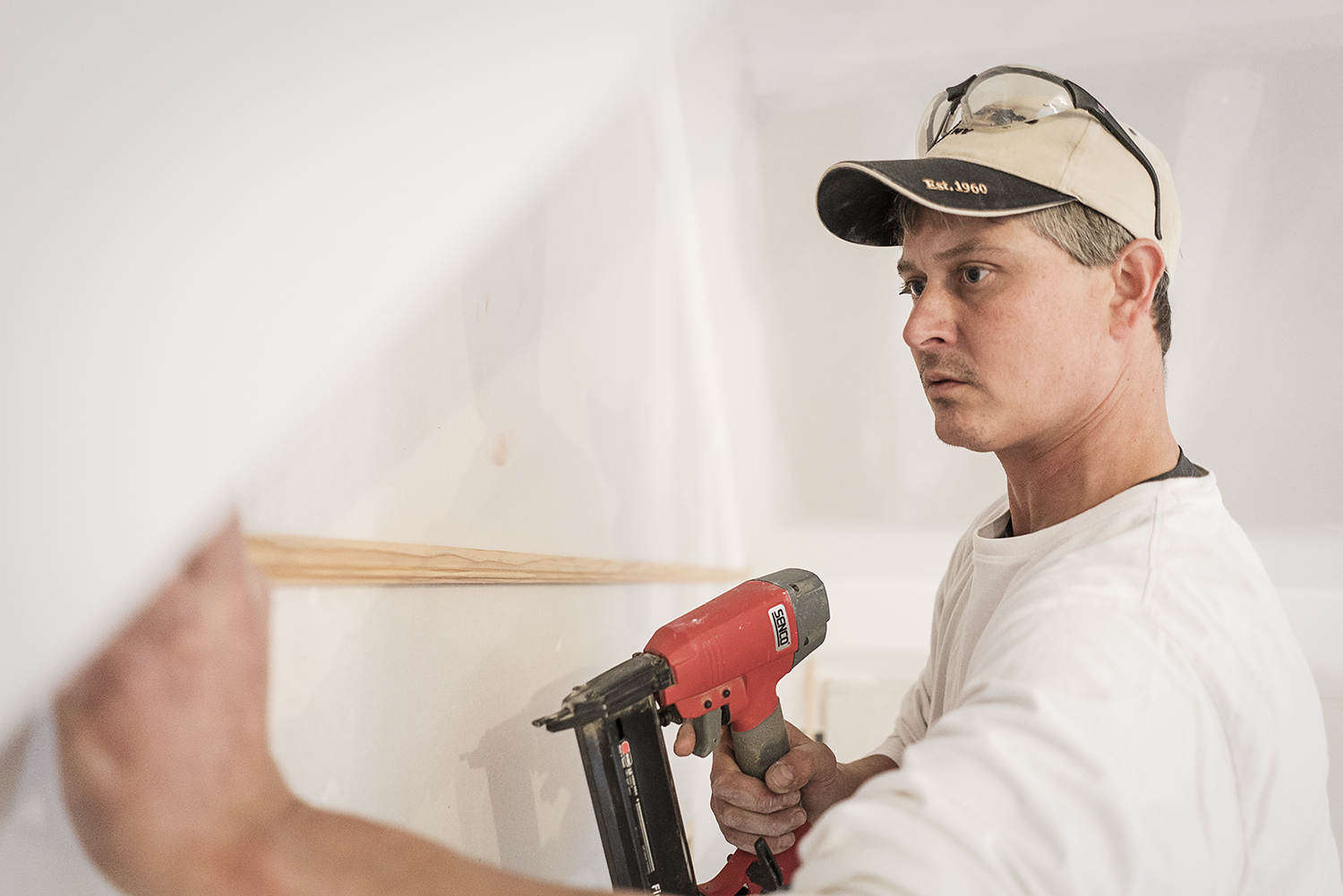 On the job today is Oxford resident Rob Smith, 43, who is cutting bead board destined for the walls on the third floor. An expert in detail trim work, Smith is one of a small crew working to reopen the storied home.